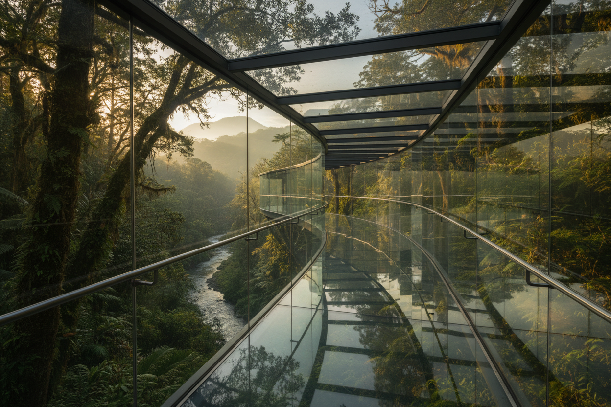 - Glass hallway showcasing spectacular forest views